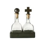 Twin glass bottles with balín and cross toppers in wax cast coaster. Use for bath salts, bath splash, lemon juice, oil & vinegar...